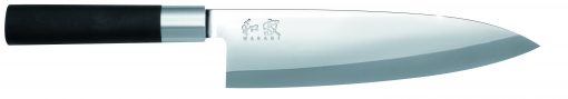 Typický japonský filetovací nôž Wasabi Black (21 cm). Predná časť noža ideálna na filetovanie, zadná hrubšia časť čepele používaná na rezanie hrubších kusov rýb.